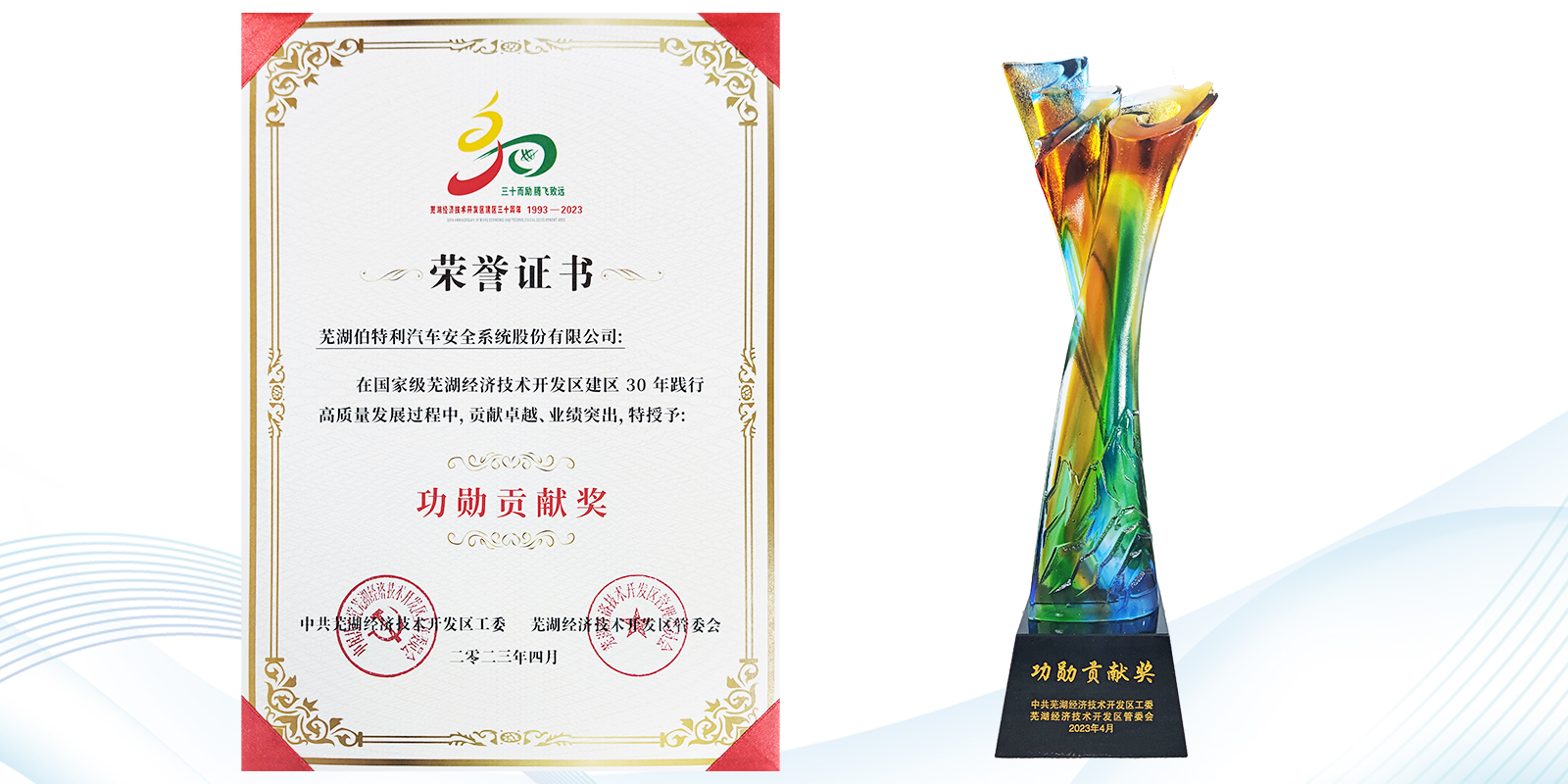 2023年4月27日,國家級蕪湖經(jīng)濟(jì)技術(shù)開發(fā)區(qū)建區(qū)30周年高質(zhì)量發(fā)展大會暨重大項目集中簽約儀式圓滿舉辦,伯特利董事長袁永彬博士、副總經(jīng)理陳忠喜先生應(yīng)邀出席本次大會。伯特利與奇瑞控股集團(tuán)、海螺集團(tuán)、信義集團(tuán)等多家企業(yè),榮獲建區(qū)30周年高質(zhì)量發(fā)展“功勛貢獻(xiàn)獎”。