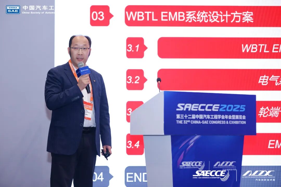 大會期間,伯特利基礎制動總工李運動先生以“EMB技術方案及開發進展情況”為主題分享了伯特利在機械式線控制動領域的最新進展。機械式線控制動系統EMB,通過中央控制器CCU將接收到的電子制動踏板信號傳遞至輪端WCU,通過WCU電機轉動推動活塞向前運動,達到制動目的。